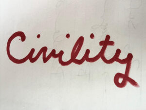 Perhaps civility is a way to mend the distrust and division we are experiencing. As my Mother used to say, if you don’t have something nice to say, don’t say anything. I used to say that was terribly boring. Now, I think boring is a blessing. Like peace and quiet.